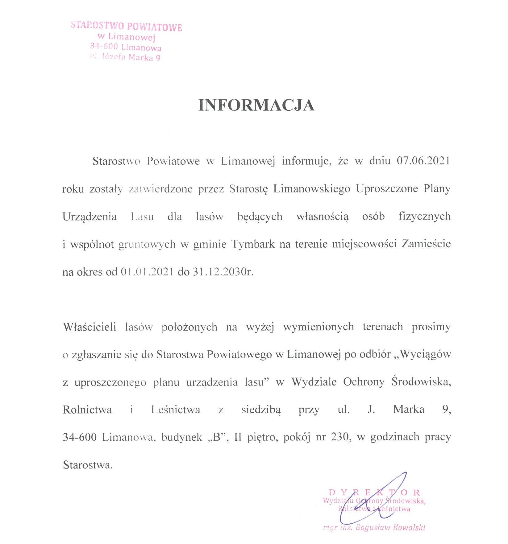 Starostwo Powiatowe w Limanowej prosi o zgłaszanie się po odbiór "Wyciągów z uproszczonego planu urządzania lasu"
