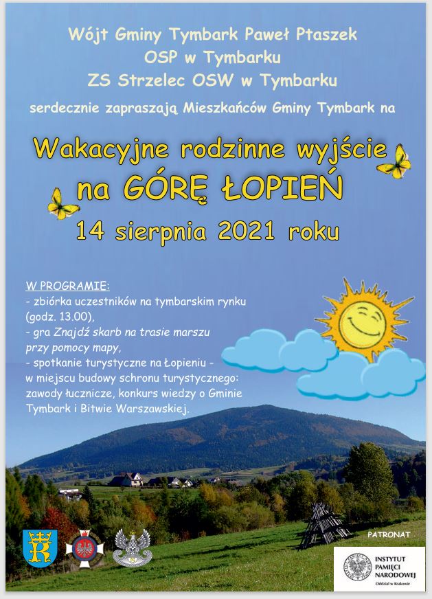Wójt Gminy Tymbark Paweł Ptaszek, OSP w Tymbarku, ZS Strzelec OSW w Tymbarku serdecznie zapraszają Mieszkańców Gminy Tymbark na Wakacyjne rodzinne wyjście na GÓRĘ ŁOPIEŃ - 14 sierpnia 2021 roku.