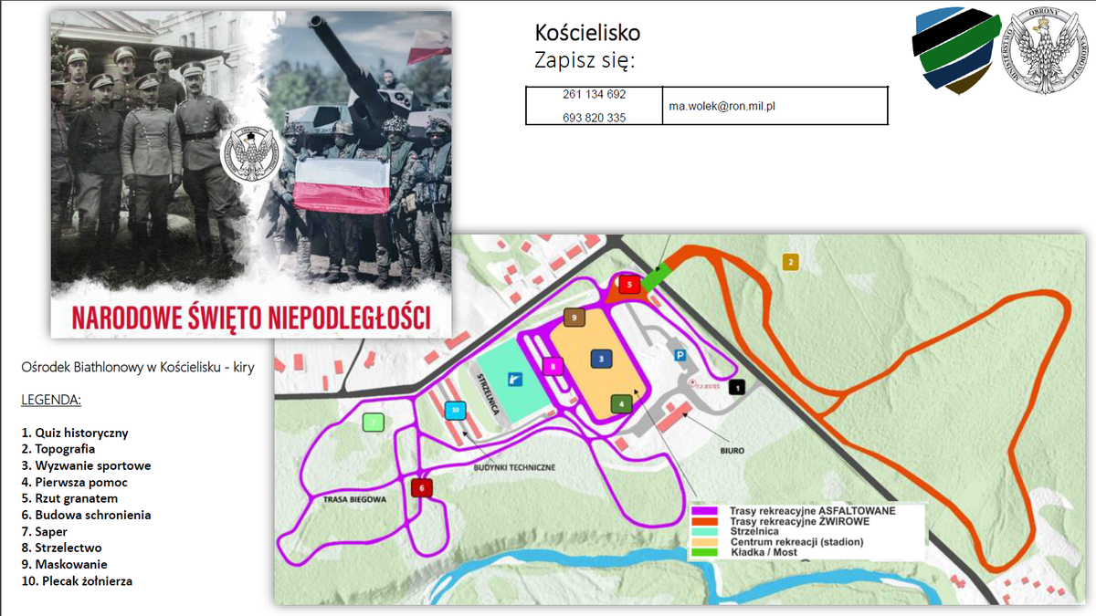 Wojskowe gry terenowe to zawody społeczno-obronne, które będą zlokalizowane wokół jednostek wojskowych, miejsc pamięci oraz skwerów i placów miast. Zawody odbędą się w każdym województwie - po jednej grze na województwo. Celem tak pomyślanej zabawy jest promowanie postaw patriotycznych i obronnych, przeżycie obchodów Narodowego Święta Niepodległości w połączeniu z dbałością o zdrowie społeczeństwa oraz promocja służby wojskowej. – Będzie to czas spędzony na wojskowej rywalizacji, a jednocześnie świetny sposób na uczczenie Biało-Czerwonej. Gwarantujemy dobrą zabawę i zapewnimy wojskowe wyżywienie – zapewniają organizatorzy.