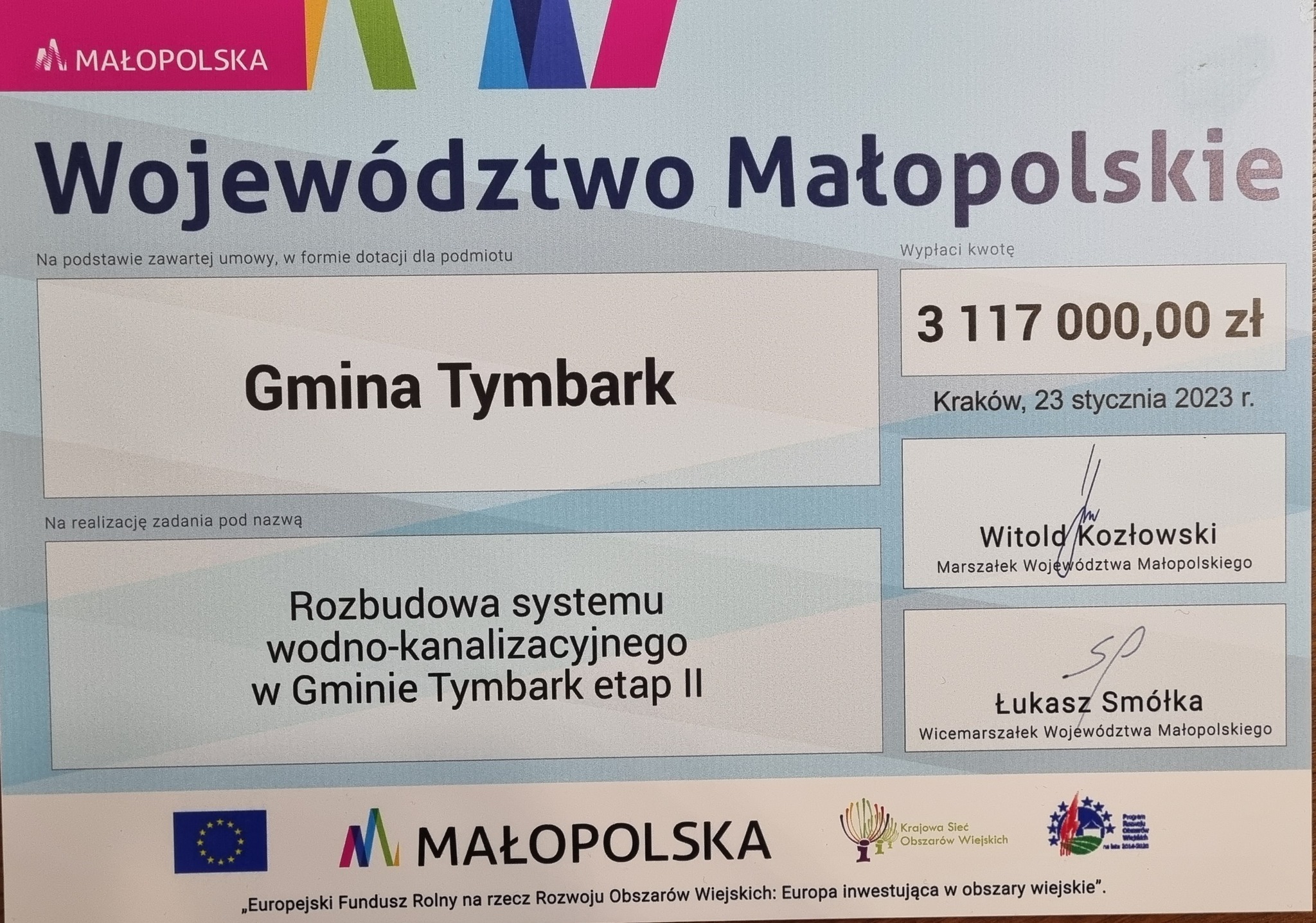 Obecnie Gmina jest na etapie oceny ofert, które wpłynęły na realizację zadania pn. „Rozbudowa systemu wodno-kanalizacyjnego w Gminie Tymbark ETAP II. Inwestycja jest dofinansowana z PROW-u w kwocie 3 117 000 zł.
